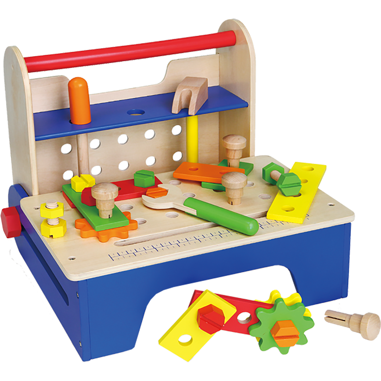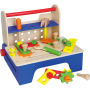 This awesome 32-piece toolset includes a screwdriver, hammer, wrench, 3 gears, 6 hole connectors, 4 nails, 8 bolts and 8 nuts which are neatly stored in a foldable toolbox.