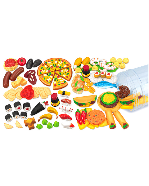Our giant play food set includes 100 rugged plastic pieces representing cuisine from Japan, Italy, China and Mexico.