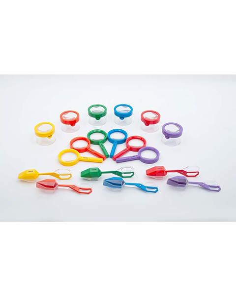 A bumper set of brightly coloured exploration tools consisting of the Rainbow Magnifiers, Rainbow Viewers and Rainbow Tongs.