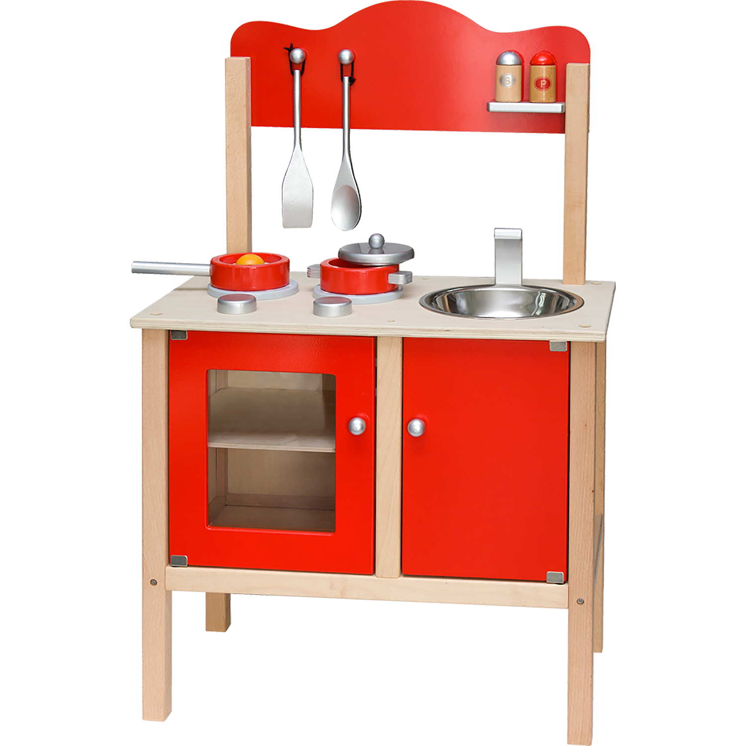 Assorted accessories include 1 spatula, 1 cooking spoon, 1 saucepan with lid, 1 frying pan with egg and 2 seasoning jars.