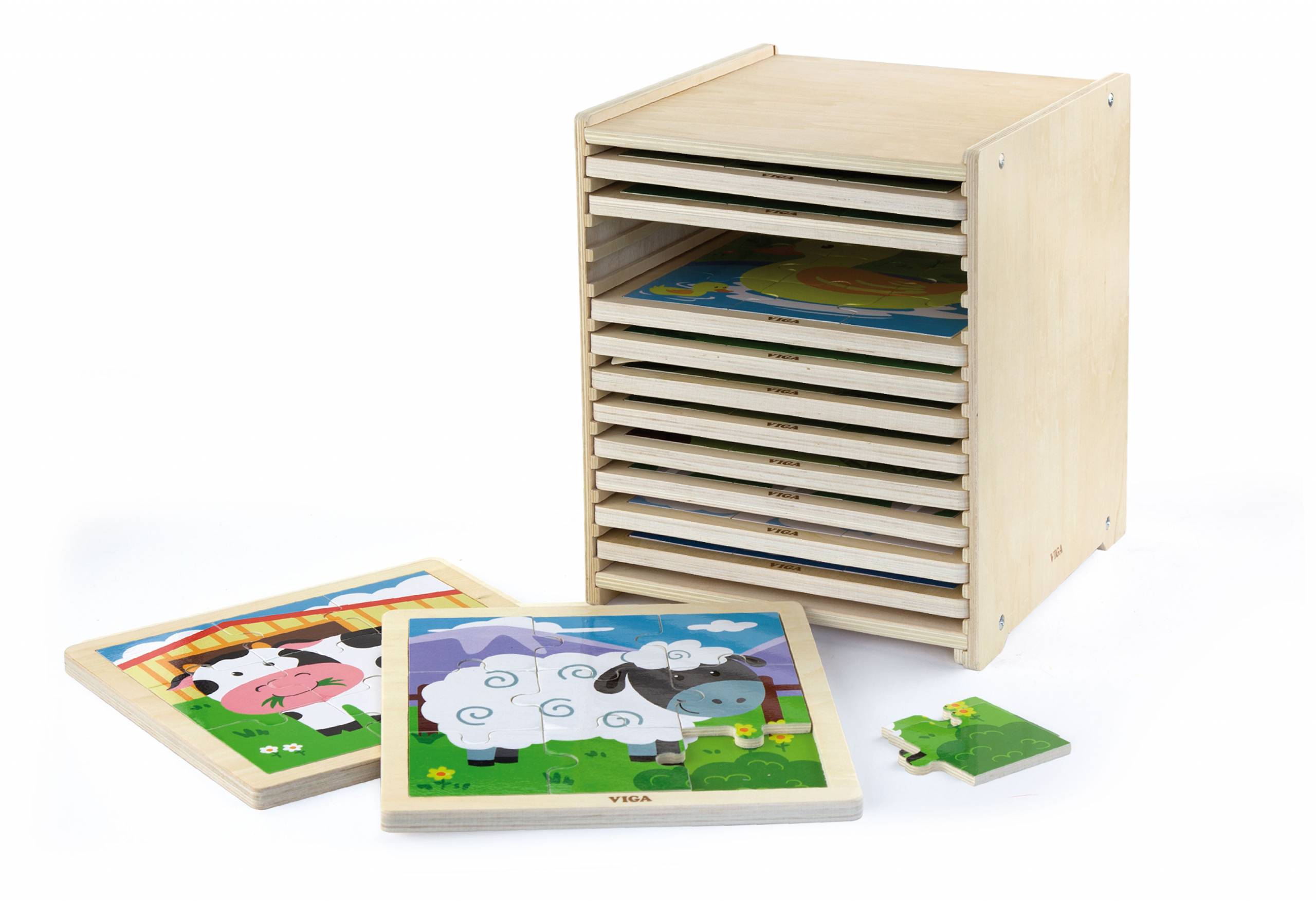 Each set consists of 12 9 piece puzzles and includes a stand for storing boards, for easy cleanup.