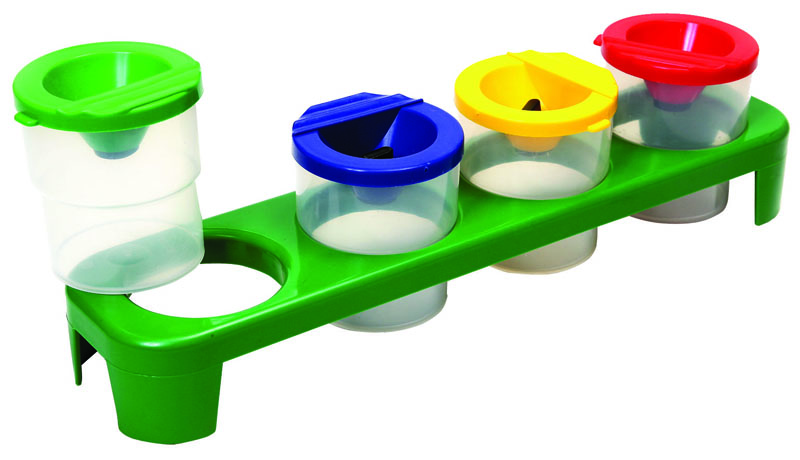 Keep mess to a minimum with brightly coloured paint pots, Each paint pot features a non-drip paintbrush holder lid and a clear paint well.